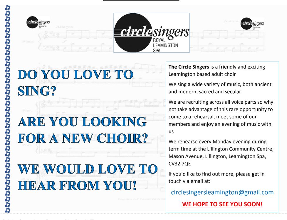If you, or someone you know, would like to find out more, please come along to a rehearsal (we are at Lillington Community Centre, Mason Avenue, Leamington Spa, CV32 7PW every Monday during term time from 7:45pm) or email circlesingersleamington@gmail.com